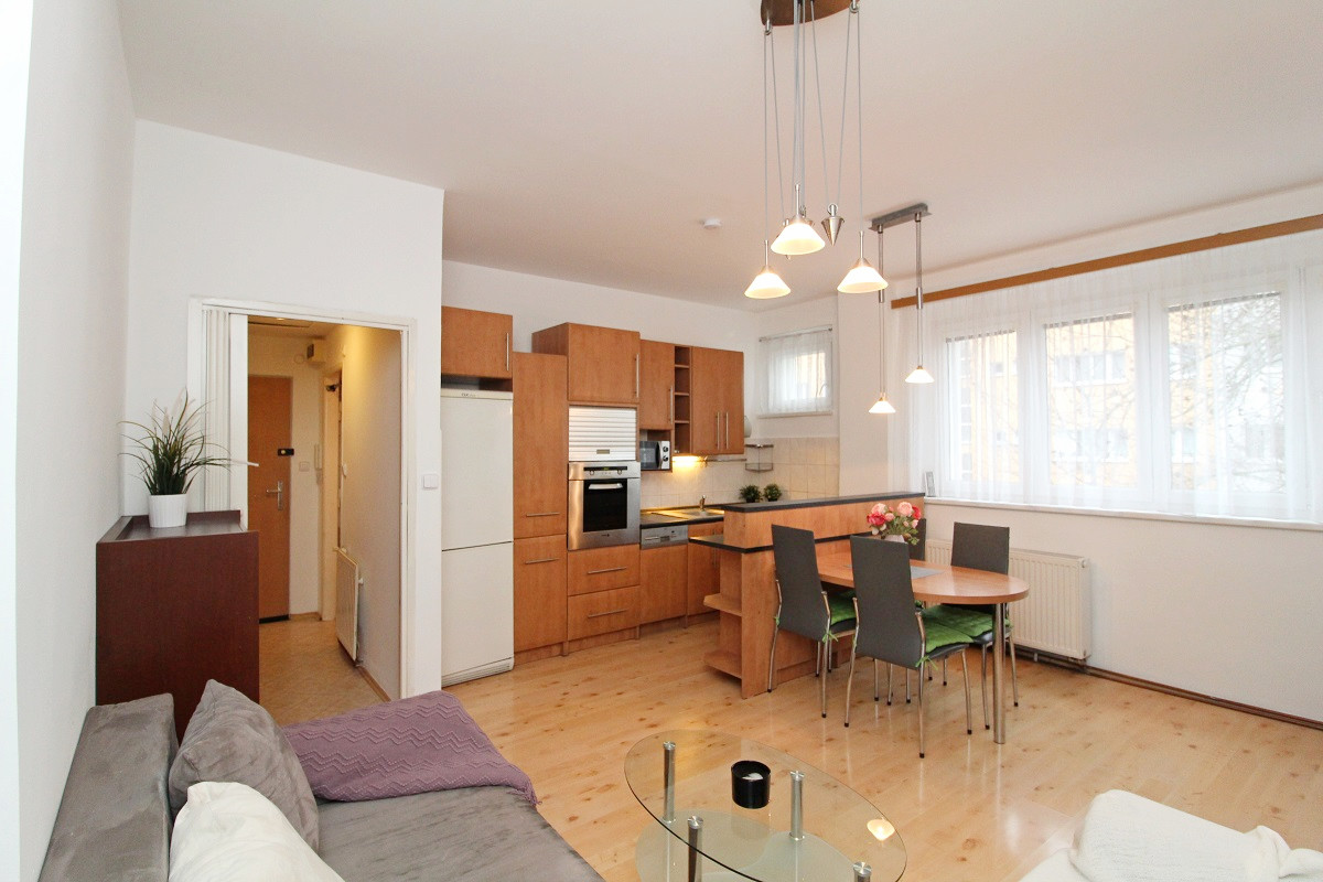 Byt se skládá z obývacího pokoje spojeného s kuchyňským koutem, samostatné ložnice, koupelny a předsíně. Kuchyň je plně vybavená moderními spotřebiči, včetně mikrovlnné trouby, vestavěné elektrické trouby, plynové varné desky, samostatné lednice s mrazničkou a myčky. Koupelna disponuje sprchovým koutem a pračkou.